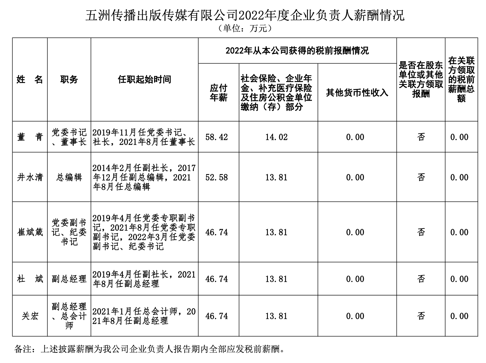 五洲传播出版传媒有限公司2022年度企业负责人薪酬情况