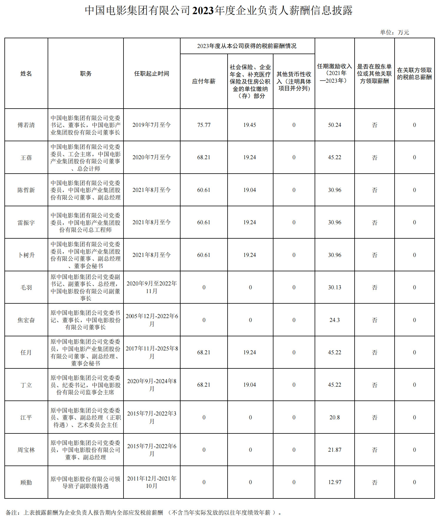 中国电影集团有限公司2023年度企业负责人薪酬信息披露