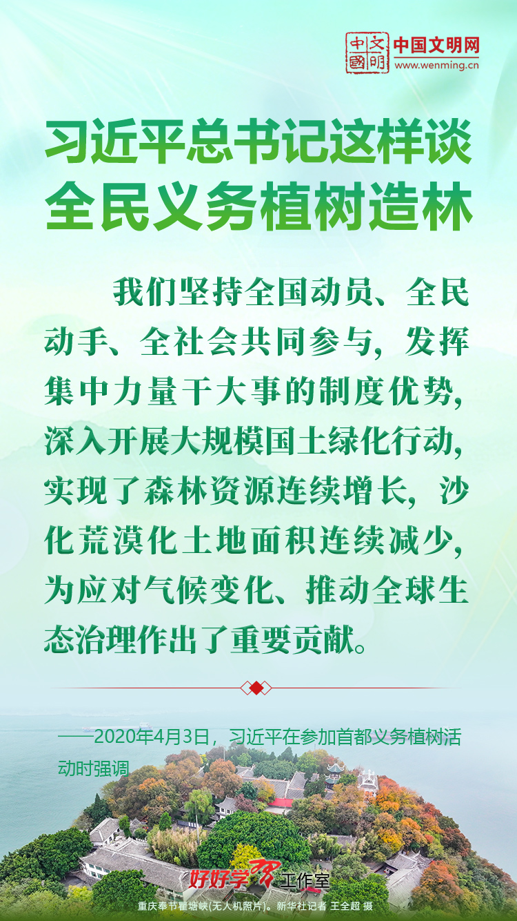 习近平总书记始终关心国土绿化事业。党的十八大以来,习近平总书记每年都参加首都义务植树活动,并发表重要讲话。让我们一起重温习近平总书记关于植树造林的重要讲话精神,积极行动起来,从义务植树做起,植出绿水青山和金山银山,让祖国大地更加绿意盎然、生机勃发。