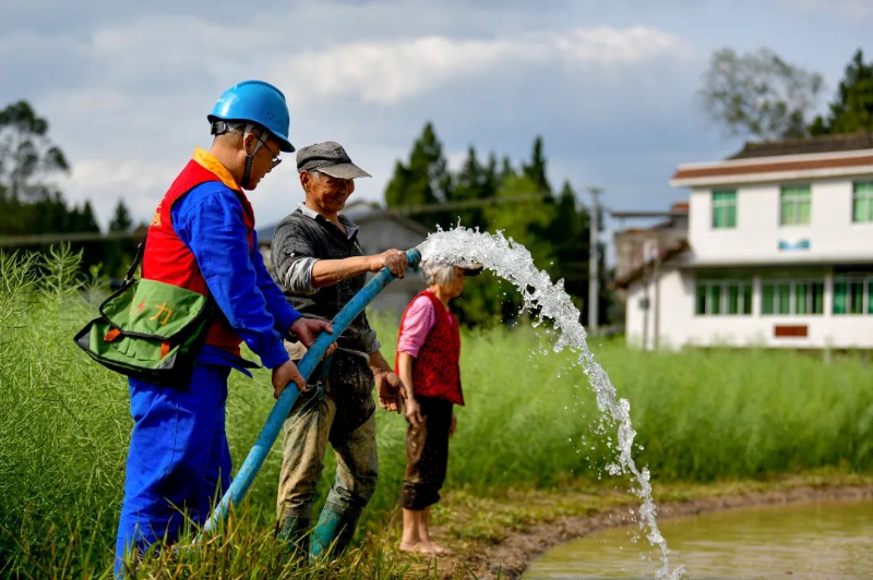 正值春耕,阆中市新时代文明实践中心组织多个志愿服务团队,走在田间地头,开展助农助产学雷锋活动,服务民生实事。田主老李和前来走访服务的供电公司员工一起站在喷灌机前检查通水情况。