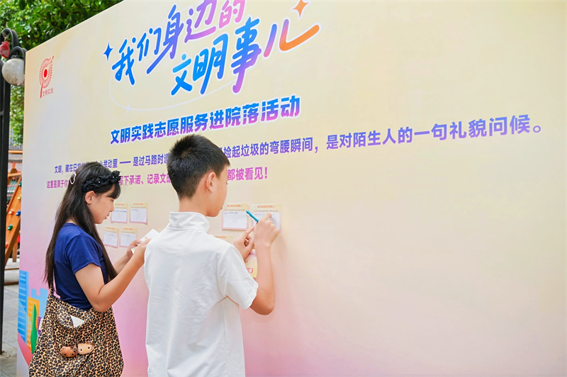 新时代文明实践志愿者利用“私拉电线”“楼道堆物”等安全风险案例,为居民科普用电安全知识;小朋友将写有“不乱扔垃圾”等内容的卡片贴在“我家的文明瞬间展示墙”上;一个个废旧瓶子在孩子们手中被绘制成彩色艺术瓶,变废为宝……近日,“我们身边的文明事儿”进院落活动在四川省成都市热闹开展,沉浸式互动活动搬到了居民“家门口”,让文明成为可感、可触、可参与的生活体验。
