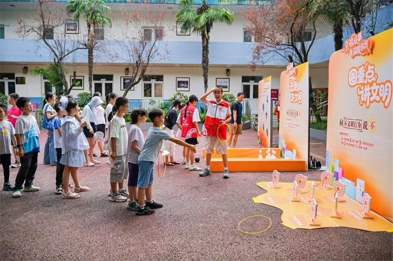 其中,成都通过设计新颖的文明互动游戏,将文明实践转化为市民喜闻乐见的参与方式。在武侯区南虹村社区,“圈重点 讲文明”游戏吸引居民用套圈选择文明行为标识,并现场分享践行经验,孩子们争相讲述“垃圾不落地”“光盘行动”等故事。