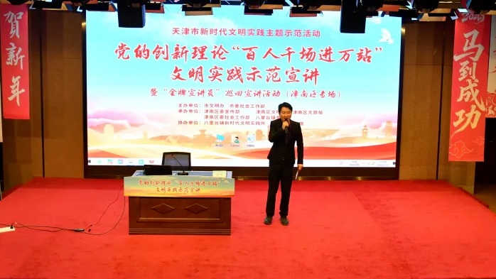 近日,天津市文明办联合天津市委社会工作部制定下发《关于开展党的创新理论“百人千场进万站”文明实践示范宣讲暨“金牌宣讲员”巡回宣讲活动的通知》,指导各区依托各级新时代文明实践阵地,采取“1场主题宣讲+N个微宣讲+N项便民服务”模式,组织开展16场主题示范宣讲活动,带动全市5000多个文明实践所、站开展主题宣讲,推动党的创新理论深入基层、热在群众。