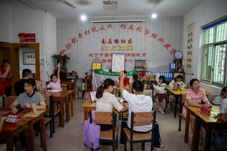 7月22日,湖北省咸宁市咸安区温泉街道南昌路社区组织的家长课堂活动。新华网 钟奕 摄