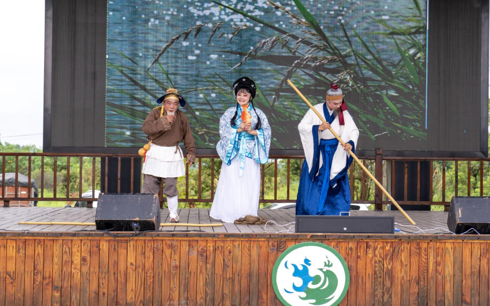 7月14日,湖南省岳阳市屈原管理区河泊潭村屈子纪念园廉政花鼓戏《大夫殉国》举行展演,图为三名演员正在为游客们表演。新华网 钟奕 摄