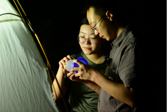 2024年9月9日,张超、张芯语在进行蛾类采集、拍照工作。新华网发(重庆市江津区融媒体中心 苏盛宇 摄)