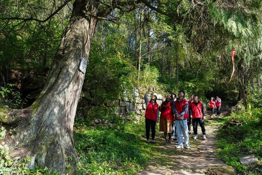 在广元市剑阁县,古蜀道上翠云廊,7000多株古柏绵延三百里,绿意如黛。一群红马甲穿梭林间——他们是“大蜀道·蜀小兵”志愿服务队翠云廊古树名木保护志愿服务分队的志愿者。