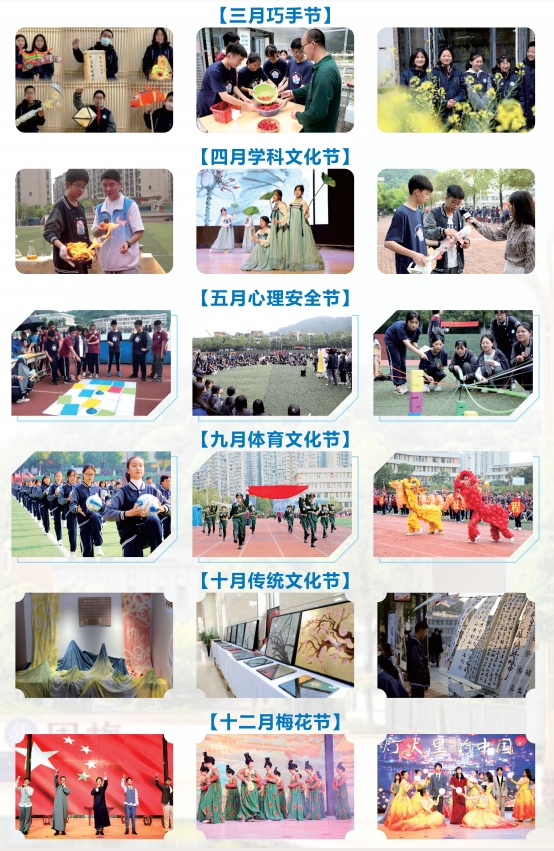 除传统文化节外,其余“四季六节”各有侧重,同样入课入心。巧手节让劳动技能与生活美学融合,科技创新的脉搏与时代同频共振。学科文化节让学生走出课堂,科普讲座探秘深海地球,调研家乡街巷传承民俗文化。心理安全节以“幸福刮刮乐”收集日常微光,解压赋能。体育节中足球、篮球、排球等九大比赛轮番上场。梅花节中声乐赛道的民歌新唱、舞蹈专场的汉唐与街舞共舞。